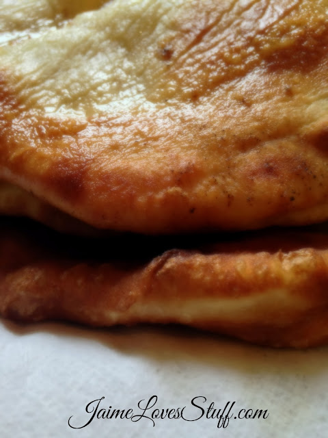 Follow the directions on the bag of rolls in regards to defrosting them and allowing them to rise. Flour a counter/wood board/whatever and rollout the dough the a good size that you like. Make sure your oil is nice and hot and fry each bread up until a nice golden, crispy. I used a small skillet but you could use a sauce pan, fry daddy, whatever and be fine.