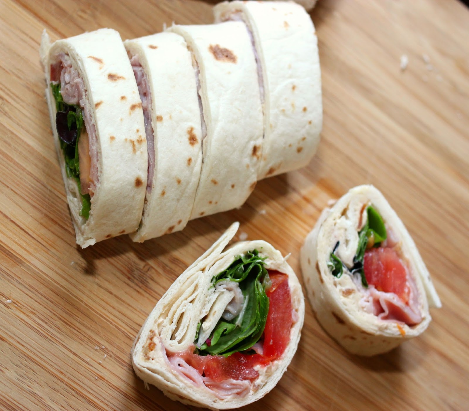 Spread cream cheese mix on a wrap (plain tortilla, lavash, or any wrap you prefer!), top with slices of ham, spring salad mix (I like O Organic brand) tomatoes and any other toppings you like.