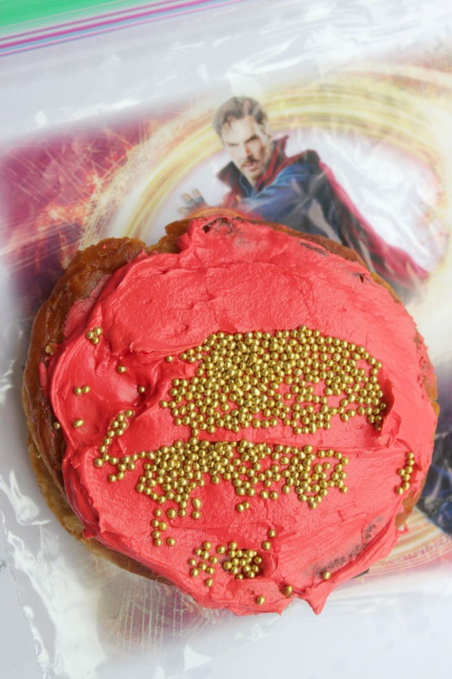 Red frosting for Iron Man with gold sprinkles. However, when I pulled out the bags and saw Dr. Strangelove, the red donuts can totally roll with Dr. Strangelove!