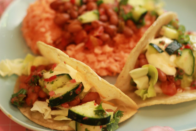 So, for Meatless Monday I still had my bean tacos. It was GOOD. I used two cans of ranch style beans (one with vidalia onions and the other with jalapenos. Oh and they're pinto beans) and a can of Rotel. I used the Mexican style (cilantro and lime in with the tomatoes and green chilies). I made a batch of spanish rice. I chopped up some cabbage and cilantro. I also made a cucumber salsa (cucumber, roma tomatoes, cilantro, jalapeno, green onions, and lime juice) to top.
