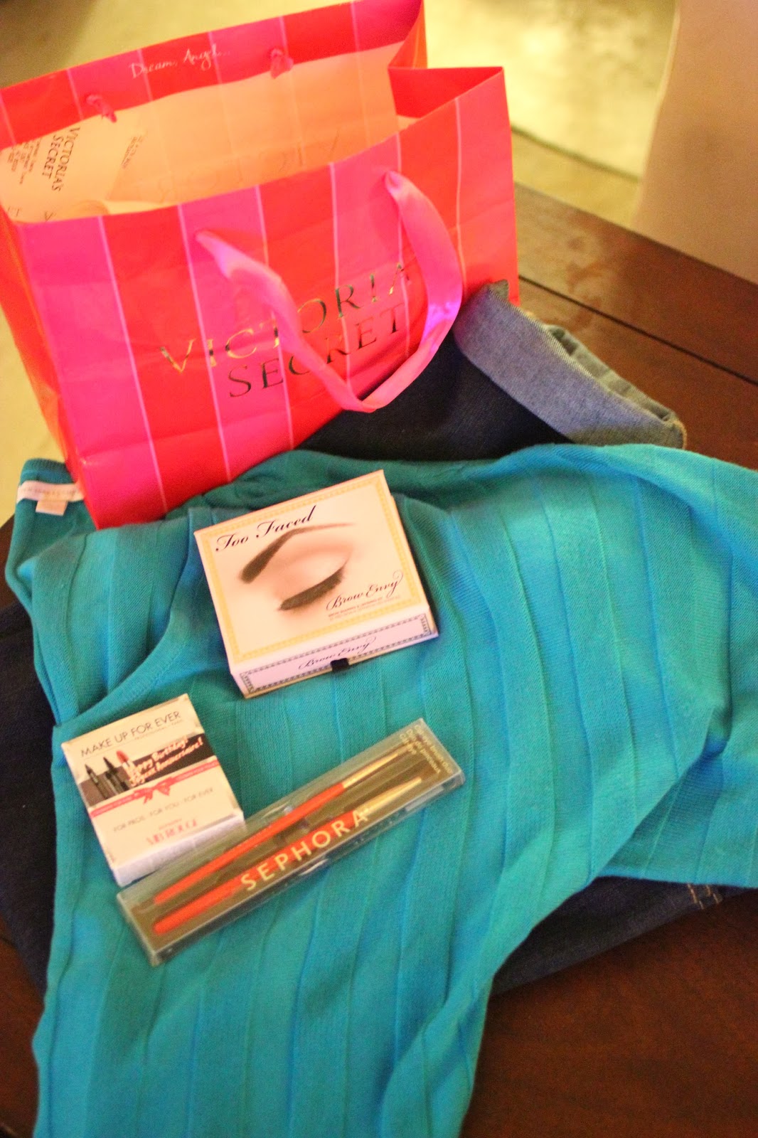 I bought myself a super cute turquoise dolman sweater and slouchy crop pants from New York and Company (Awesome sale last week!). I also treated myself to some Victoria's Secret (thank you semi-annual clearance sale). Also, if you are a Sephora Insiders member- you get a freebie during your birthday month. This month is a MakeUp For Ever mascara and lipstick! Pretty sweet! I also got myself a Too Faced Brow Kit and Sephora cat eye brushes. I did also buy myself the HAIM CD (It's AMAZING). Sorry for the crap photos :)