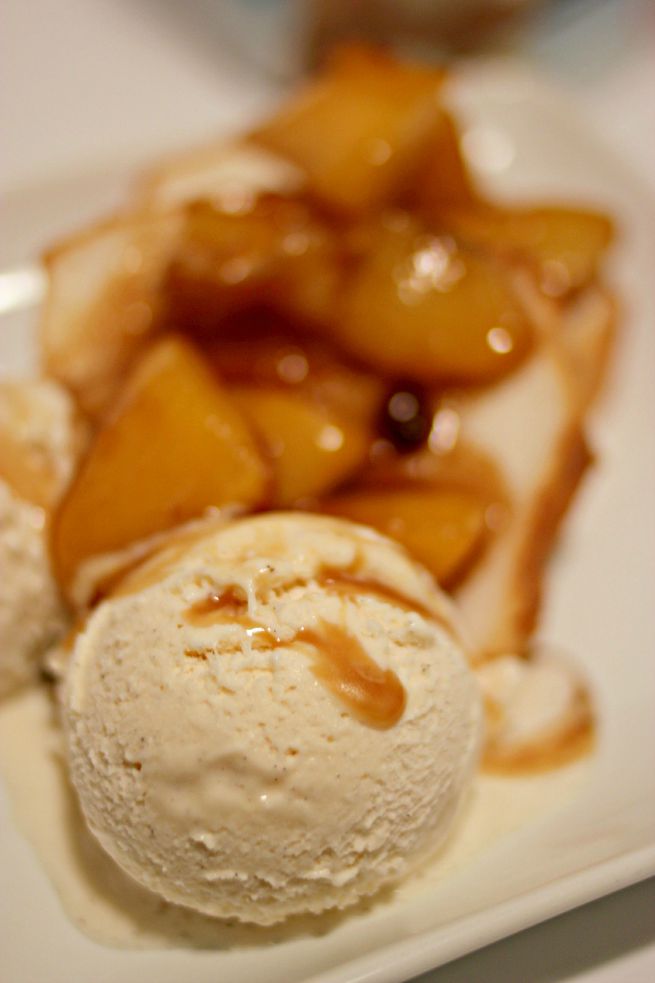 HOT buttered, caramly peaches spooned over slices of angel food cake and then topped with aforementioned froyo.